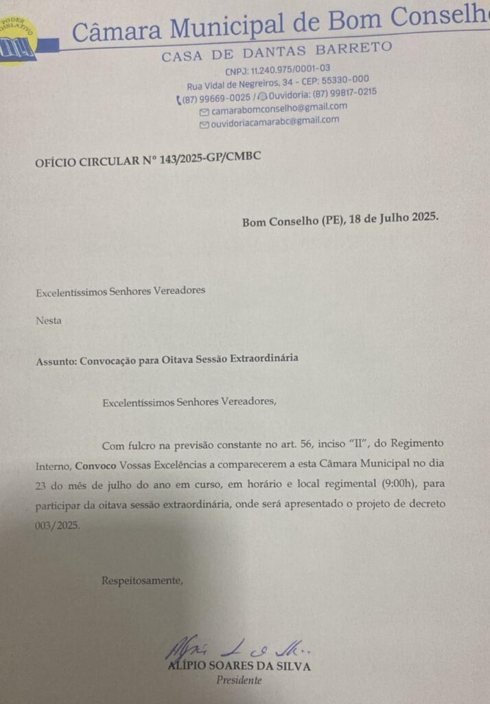 A Câmara Municipal de Bom Conselho realiza nesta quarta-feira (23), a 8ª sessão extraordinária, conforme o ofício circular nº 143/2025. Na pauta, será apreciado o veto do prefeito ao Artigo 3º do Plano de Cargos, Carreiras e Vencimentos (PCCV) da Guarda Municipal — trecho que trata do pagamento retroativo a janeiro de 2025.