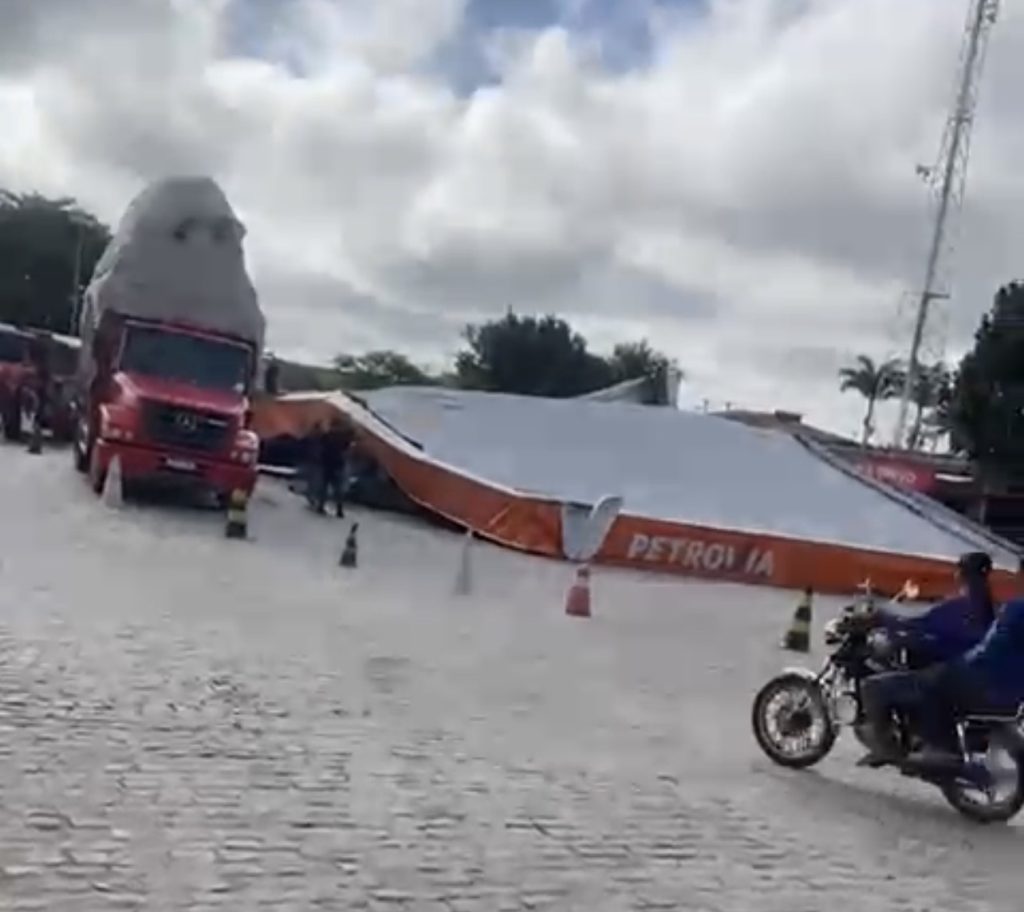 Carreta derruba parte da estrutura do teto do Posto Trevo às margens da BR-423, em Lajedo-PE