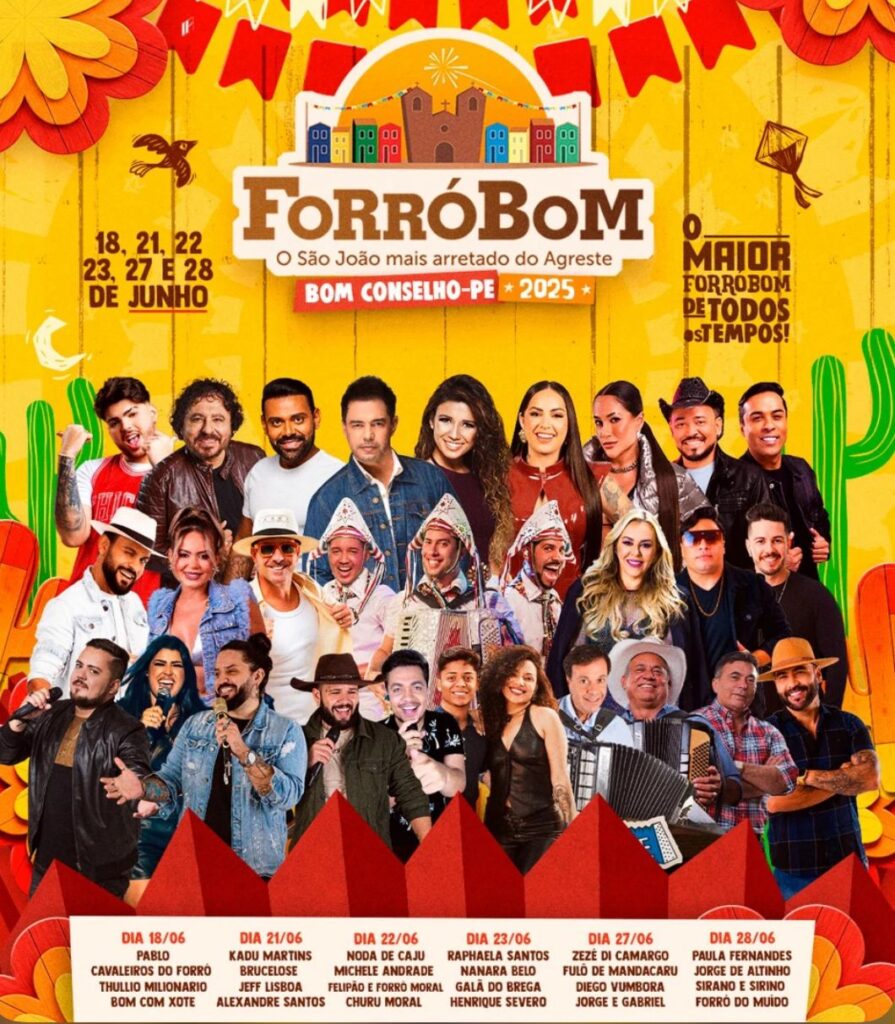 Foram publicados no Diário Oficial do Estado de Pernambuco no dia 16 de maio de 2025 os extratos dos contratos firmados entre a Prefeitura Municipal de Bom Conselho e empresas responsáveis pela contratação das atrações musicais do Forrobom 2025.