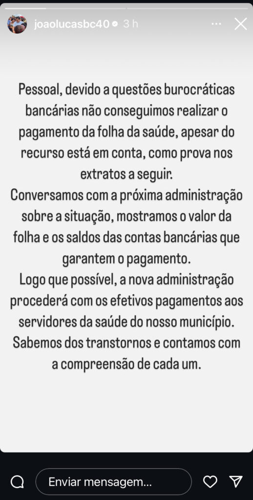 Na tarde desta terça-feira (31), o prefeito de Bom Conselho, João Lucas, utilizou suas redes sociais para esclarecer a situação envolvendo o atraso no pagamento da folha dos servidores da saúde. Mesmo com os recursos disponíveis em conta, o gestor informou que questões burocráticas impediram a conclusão do processo.
