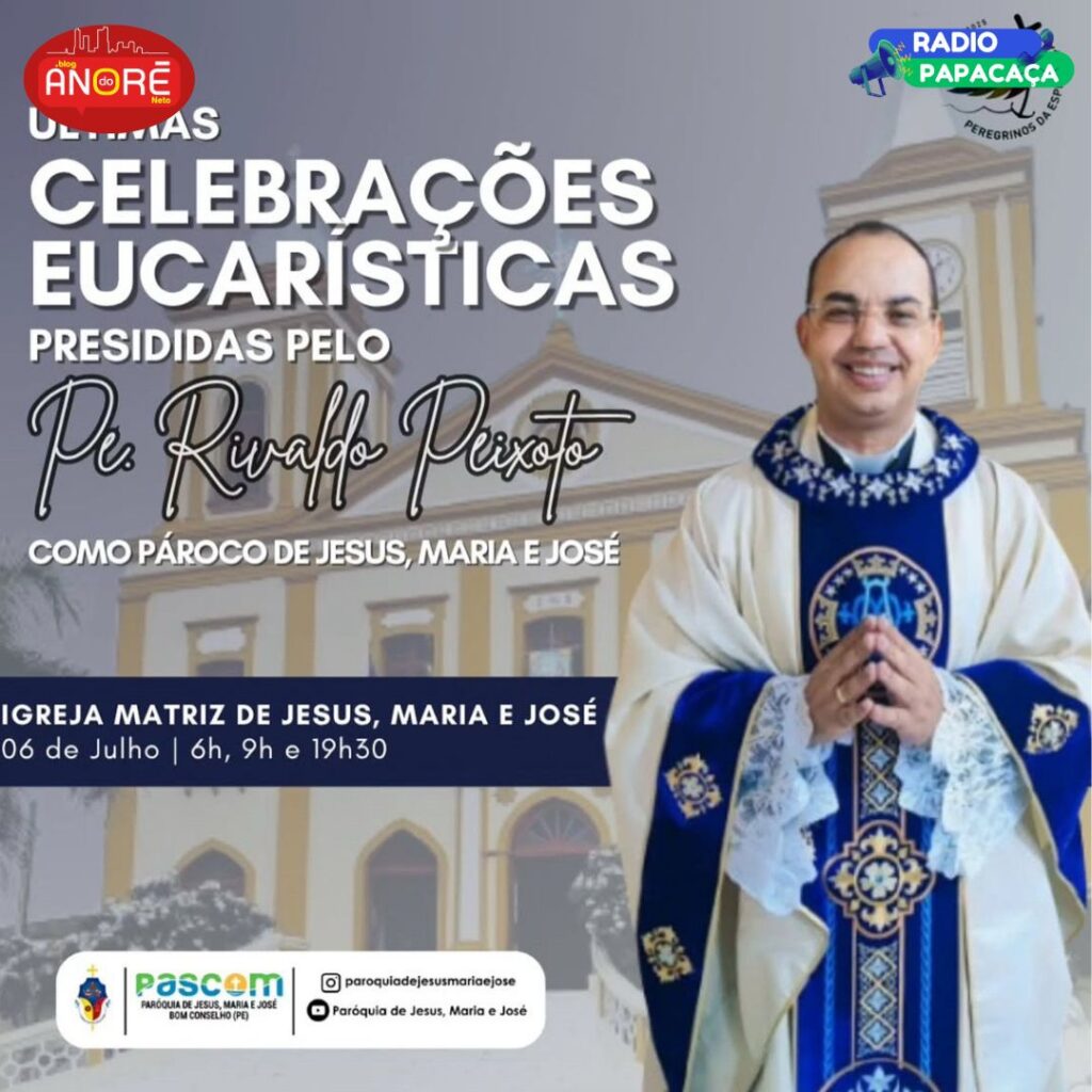 A Paróquia de Jesus, Maria e José, em Bom Conselho, viverá neste domingo, 6 de julho, um momento especial de fé e gratidão: será celebrada a última missa do Padre Rivaldo @rivaldopeixoto como pároco da cidade.